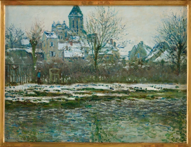 The charm of the subject lies above all in the impression of spontaneity, in the simple evocation of a family life, some traces of which remain. The table has not been cleared at the end of a meal. A hat, hanging on the branch of a tree, a bag and a parasol left on the bench seem to have been forgotten there. In the cool shade of the green foliage, little Jean Monet quietly plays with a few pieces of wood.